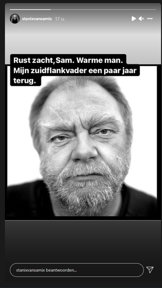 De acteur overleed afgelopen weekend op 73-jarige leeftijd en dat deed Stan Van Samang wel wat. De acteur was er even emotioneel van, want hij koestert goede herinneringen aan de samenwerking tijdens ‘Zuidflank’. “Rust zacht, Sam. Warme man. Mijn Zuidflankvader een paar jaar terug”, schrijft Stan op Instagram. Nu ja, een paar jaar klopt niet, ‘Zuidflank’ werd al in 2012 opgenomen.