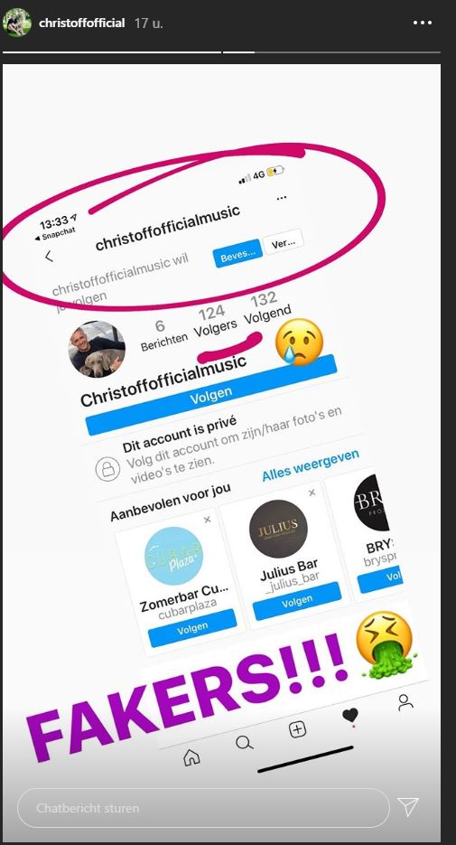 De laatste tijd is Christoff meer en meer het slachtoffer van mensen die zich voor hem uitgeven. Op Instagram duikt er alweer een profiel op dat mensen probeert te misleiden. Een profiel met de naam ‘Christoffofficialmusic’ doet vermoeden dat het om het echte profiel van de Vlaamse zanger gaat, maar niets is minder waard. Christoff wijst er zijn volgers dan ook op dat het om hier om ‘fakers’ gaat.